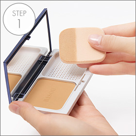 スポンジの1/3~1/2面にパウダーを取り、軽く頬にのせます。