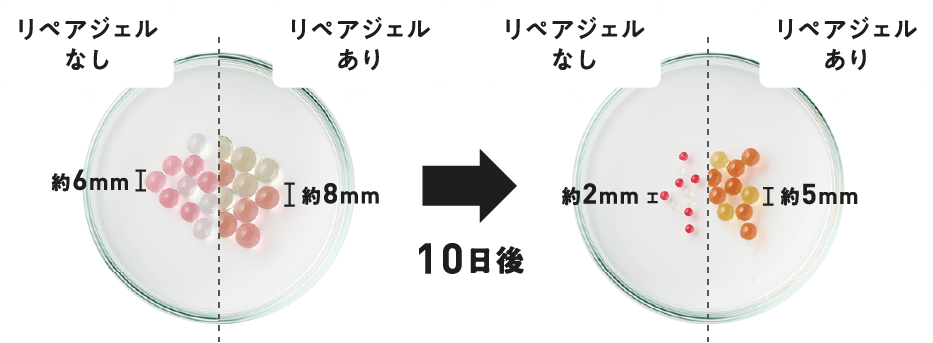 リペアジェルなしの左側は乾燥してヒビが入っていますが、リペアジェルありの右側は表面がなめらか。水分が蒸発せずに留まっていることがわかります。
